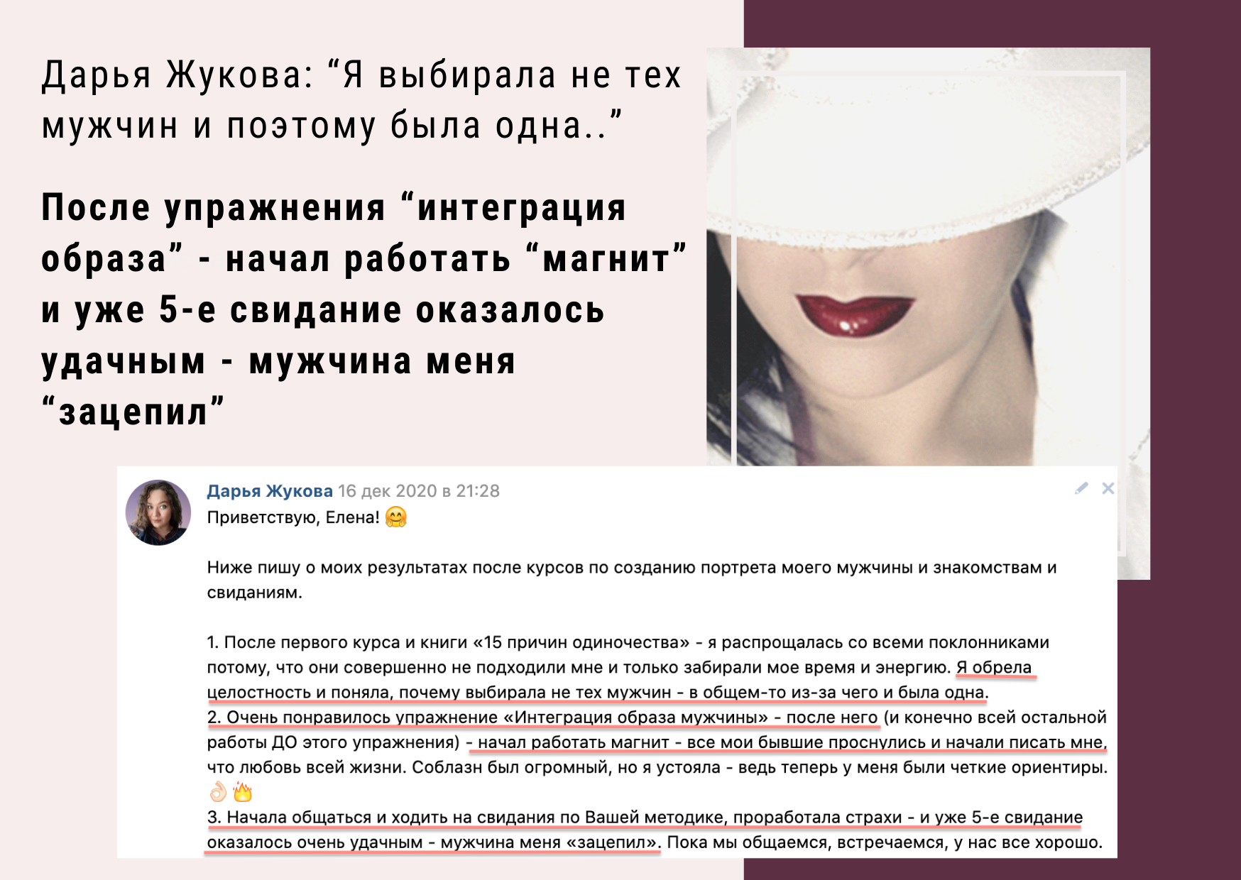 Дарья Жукова: "После упражнения "интеграция образа" - начал работать "магнит" и уже 5-е свидание оказалось удачным - мужчина меня "зацепил"
