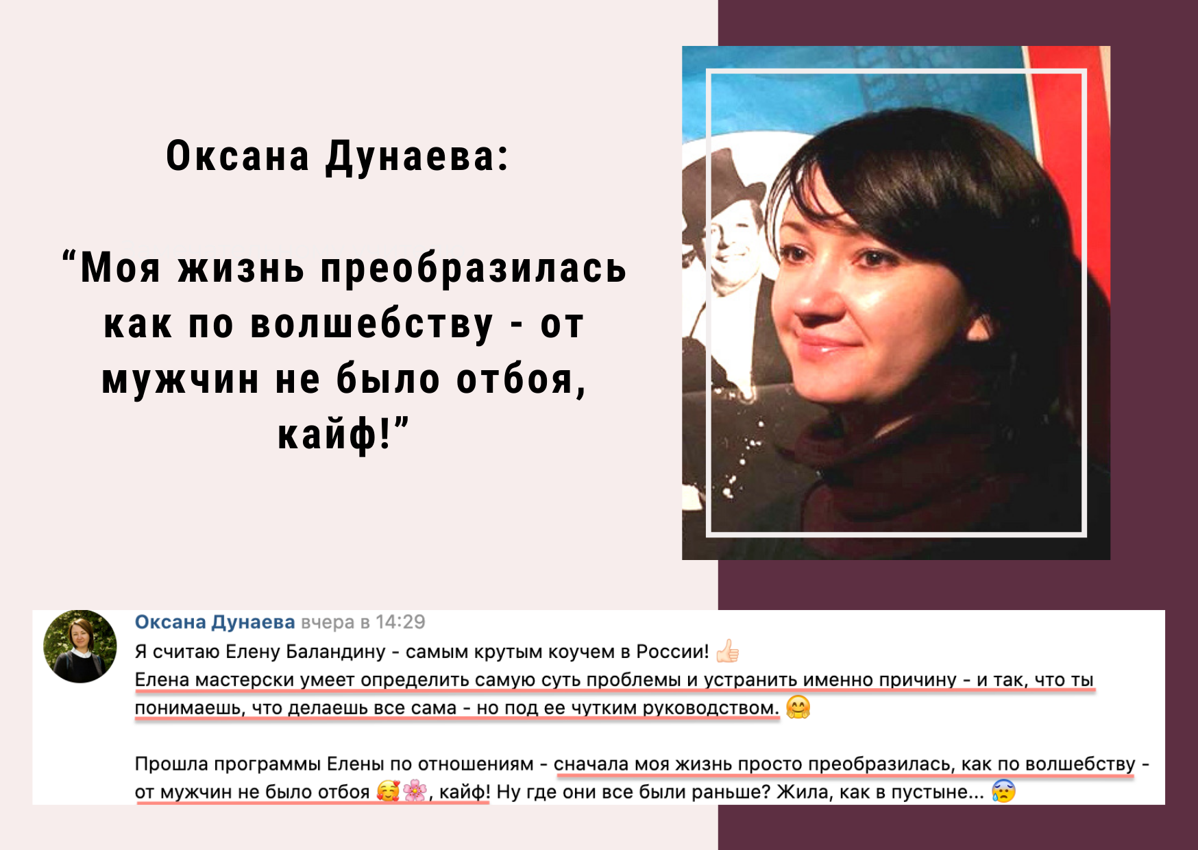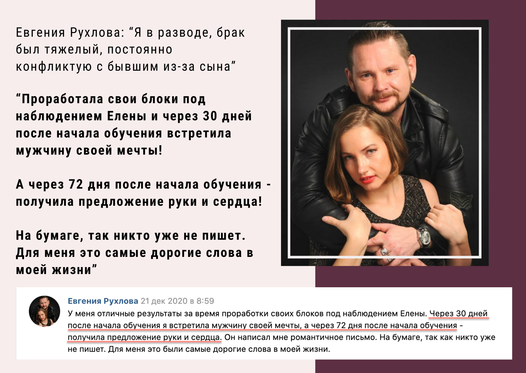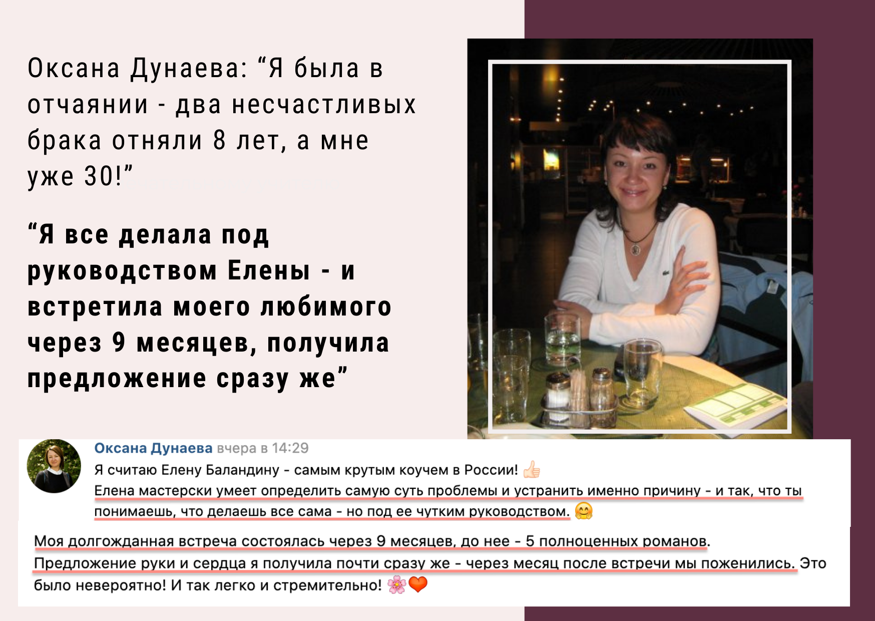 Оксана Дунаева: "Я все делала под руководством Елены - и встретила моего любимого через 9 месяцев, получила предложение сразу же!"