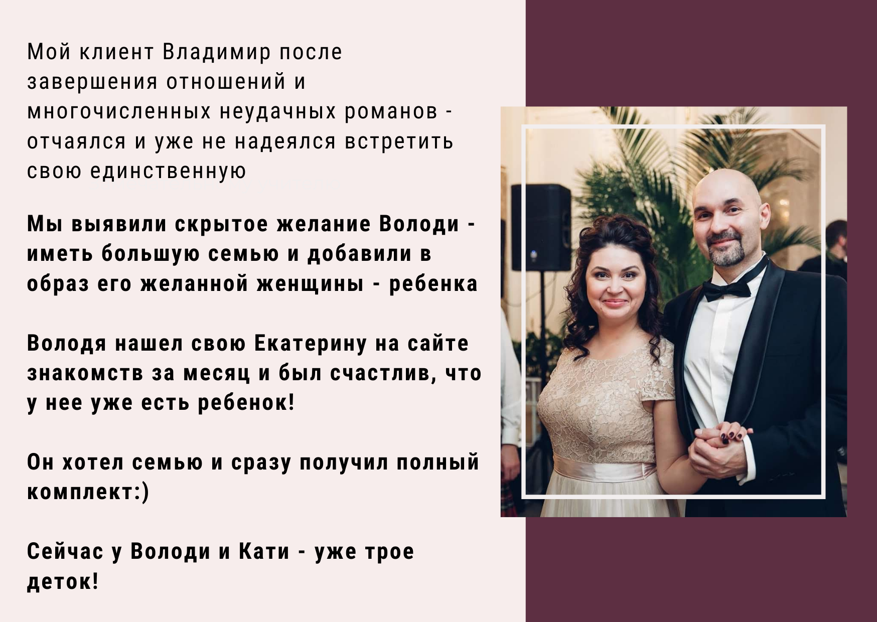 Владимир отчаялся встретить свою любовь :( Когда мы поняли, что Володя хочет большую семью - мы добавили в образ его женщины - ребенка. Через 30 дней он встретил Екатерину и был счастлив, что у нее есть малыш :) Сейчас у ребят уже 3-е деток!