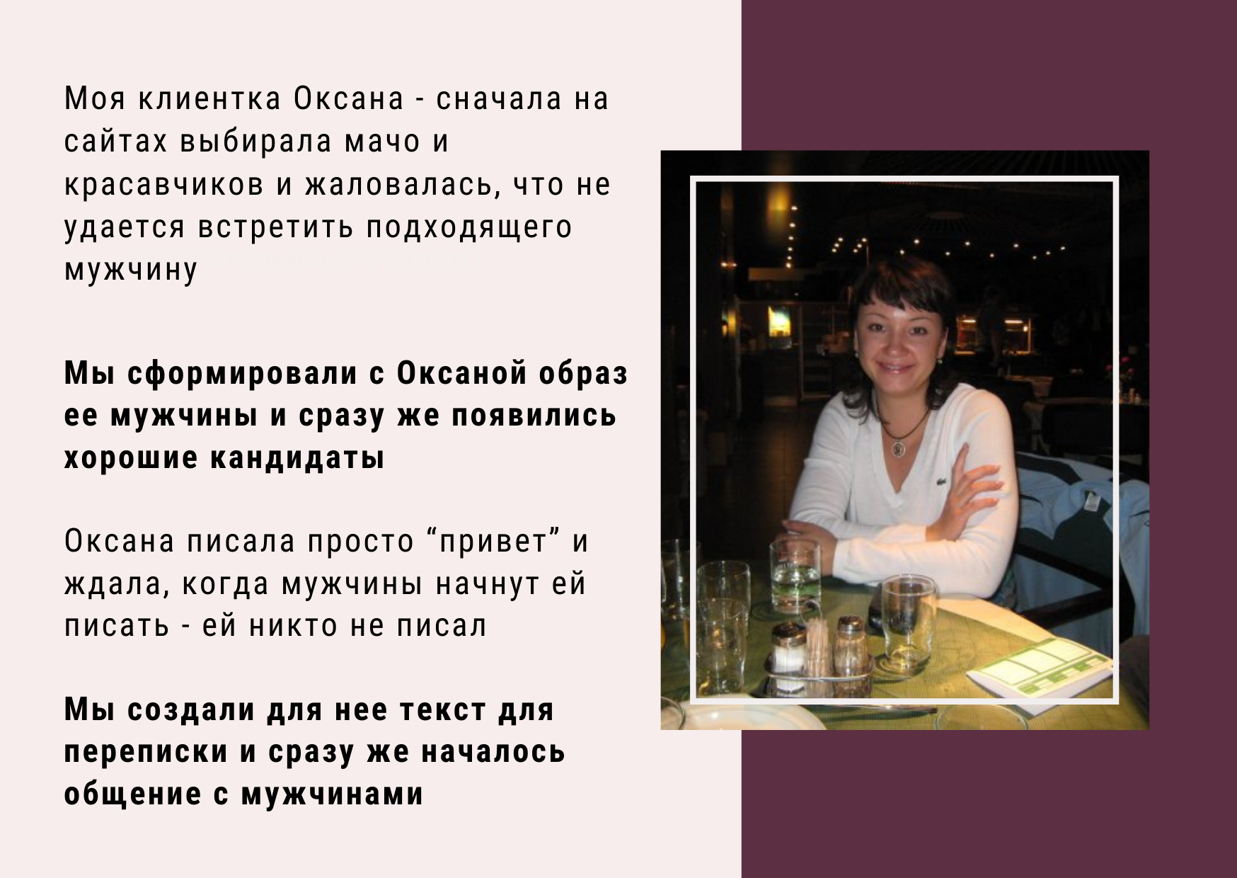 Мы написали для Оксаны текст для переписки на сайтах знакомств, и сразу началось общение с мужчинами
