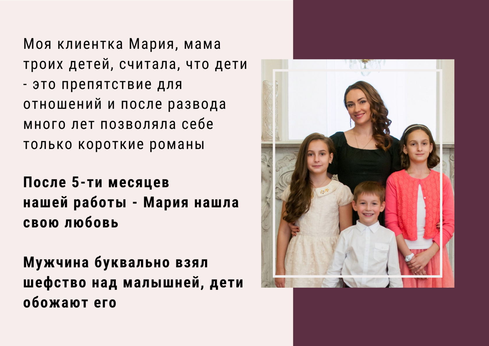 Мария, мама 3-их деток - встретила мужчину после 5-ти месяцев нашей работы, и он буквально взял шефство над малышней - дети обожают его!