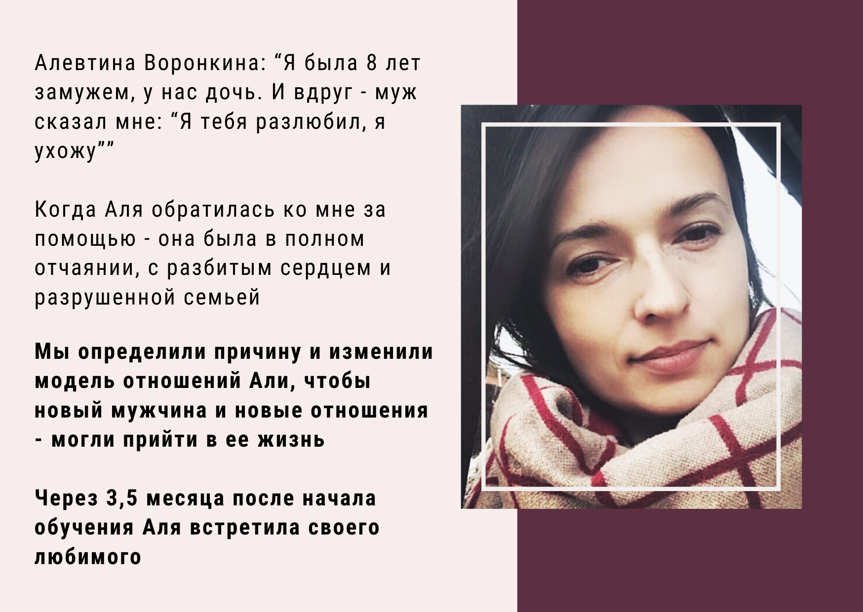После слов мужа "я тебя разлюбил, я ухожу" и полного отчаяния - мы сделали работу по изменению модели отношений, и через 3,5 месяца Аля встретила своего любимого