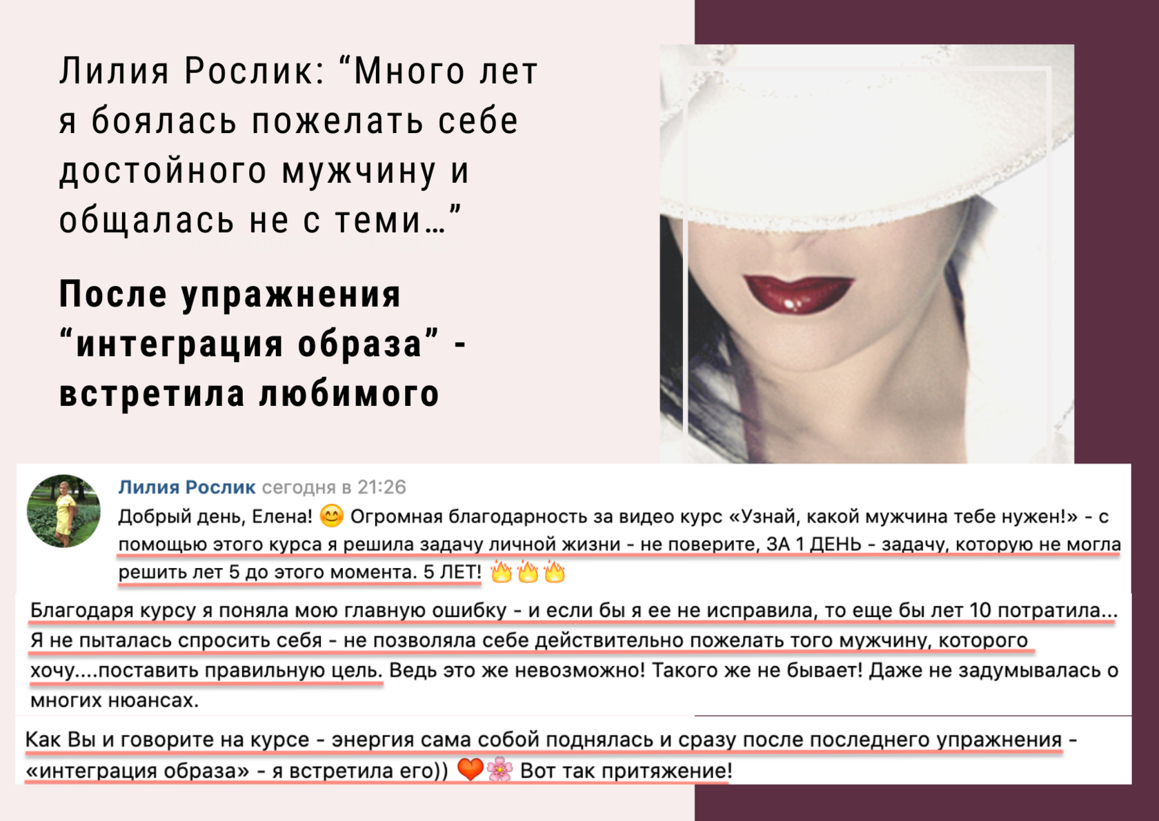 Лилия Рослик: "После курса "Узнай, какой мужчина тебе нужен" и упражнения "интеграция образа" - я встретила любимого!"